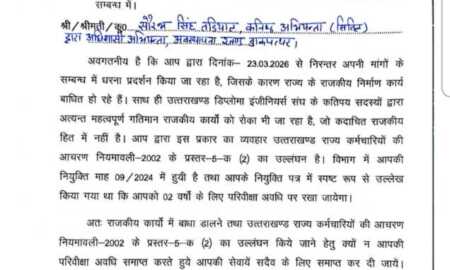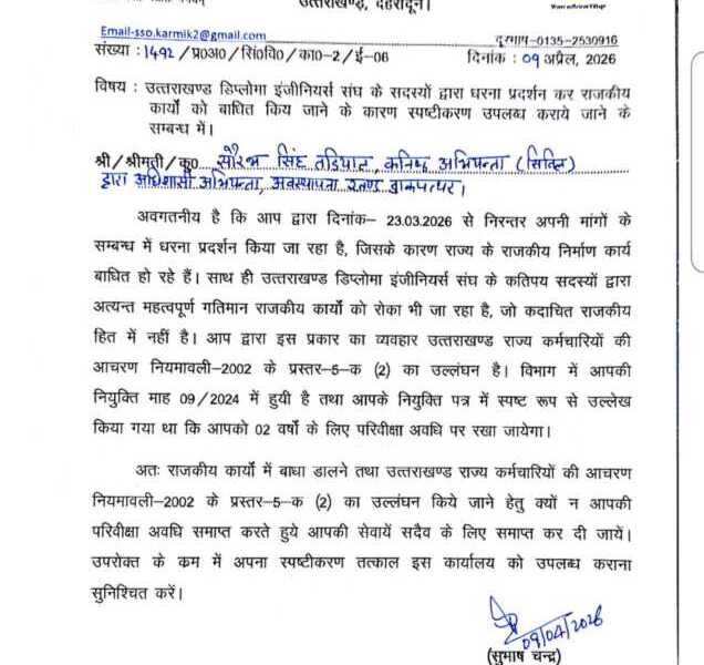 देहरादून: धरना-प्रदर्शन में शामिल इंजीनियर को नोटिस, सेवा समाप्ति की चेतावनी देहरादून, उत्तराखंड सिंचाई...