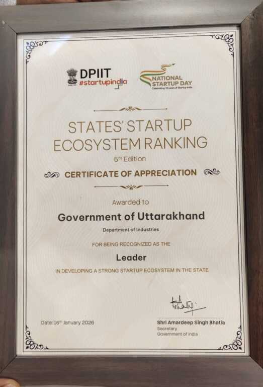 भारत सरकार के वाणिज्य एवं उद्योग मंत्रालय के अंतर्गत उद्योग संवर्धन एवं आंतरिक व्यापार विभाग (DPIIT) द्वारा जारी States’ Startup Ecosystem Ranking (5वां संस्करण) में उत्तराखण्ड को मजबूत स्टार्टअप इकोसिस्टम विकसित करने में ‘लीडर’ के रूप में मान्यता प्रदान की गई है। इस उपलब्धि के लिए राष्ट्रीय स्टार्टअप दिवस के अवसर पर उत्तराखण्ड सरकार के उद्योग विभाग को Certificate of Appreciation प्रदान किया गया।