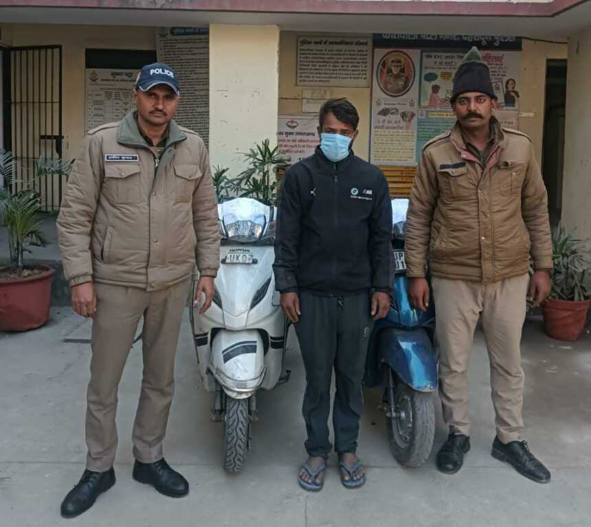 लगातार हुई वाहन चोरी की घटनाओ के दृष्टिगत वरिष्ठ पुलिस अधीक्षक देहरादून द्वारा घटनाओ के अनावरण तथा अभियुक्तों की गिरफ्तारी हेतु प्रभारी निरीक्षक पटेलनगर को आवश्यक दिशा निर्देश दिए गए, जिस पर कोतवाली पटेलनगर पर पुलिस टीम का गठन किया गया। गठित टीम द्वारा त्वरित कार्यवाही करते हुए मुखबिर की सूचना पर दिनाँक 09/01/2026 को घटना में शामिल अभियुक्त कन्हैया पुत्र अमर सिंह निवासी ब्रह्मपुरी कोतवाली पटेलनगर देहरादून उम्र 25 वर्ष को फल मंडी निरंजनपुर से गिरफ्तार किया गया, जिसकी निशान देहि पर पुलिस टीम द्वारा उक्त घटनाओ में चोरी की गयी दोनो स्कूटियो UK07DA7413 तथा UP20AU1306 को बरामद किया गया।
