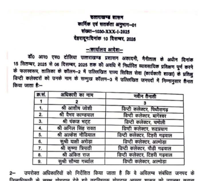 डॉ० आर० एस० टोलिया उत्तराखण्ड प्रशासन अकादमी, नैनीताल के अधीन दिनांक 15 सितम्बर, 2025 से 06 दिसम्बर, 2025 तक की अवधि में निर्धारित व्यावसायिक प्रशिक्षण पूर्ण करने के फलस्वरूप, तालिका के कॉलम-2 में उल्लिखित राज्य सिविल सेवा (कार्यकारी शाखा) के प्रशिक्षु डिप्टी कलेक्टरों को उनके नाम के सम्मुख कॉलम-3 में उल्लिखित जनपदों में निम्नानुसार तैनात किया जाता है:-