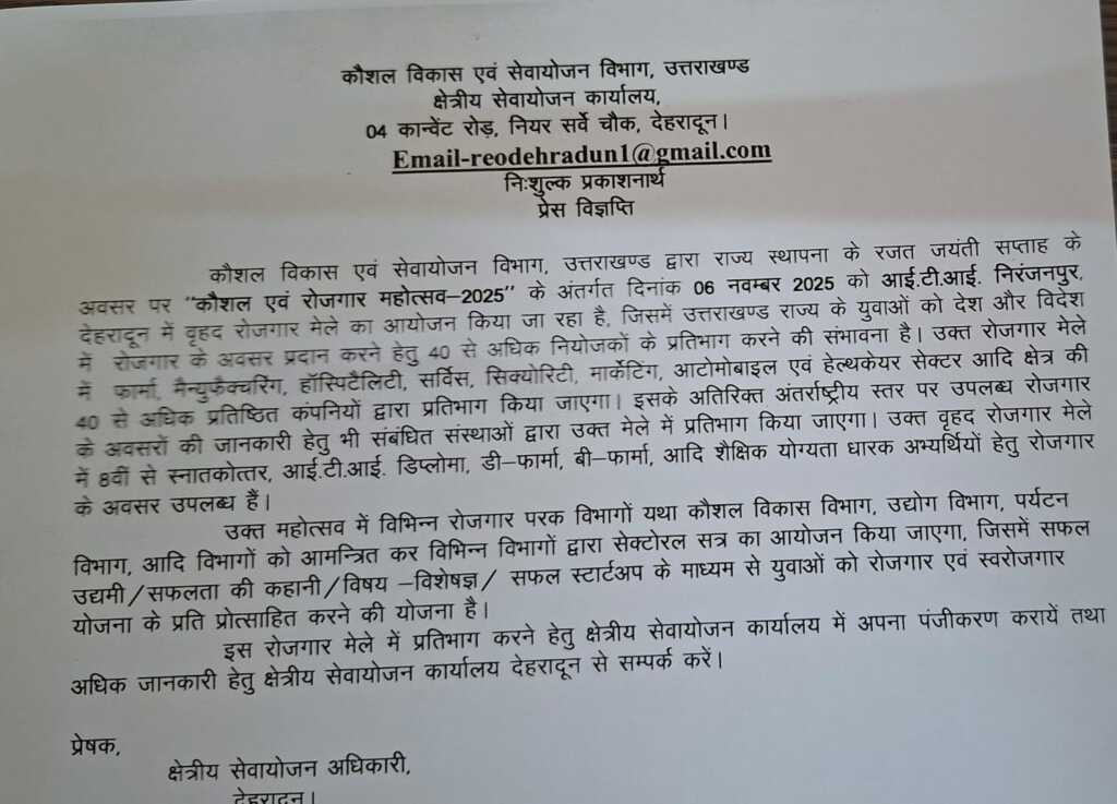कौशल विकास एवं सेवायोजन विभाग, उत्तराखण्ड द्वारा राज्य स्थापना के रजत जयंती सप्ताह के अवसर पर ‘‘कौशल एवं रोजगार महोत्सव-2025’’ के अंतर्गत 06 नवम्बर,2025 को आई.टी.आई. निरंजनपुर, देहरादून में वृहद रोजगार मेले का आयोजन किया जा रहा है, जिसमें उत्तराखण्ड राज्य के युवाओं को देश और विदेश में रोजगार के अवसर प्रदान करने हेतु 40 से अधिक नियोजकों के प्रतिभाग करने की संभावना है।