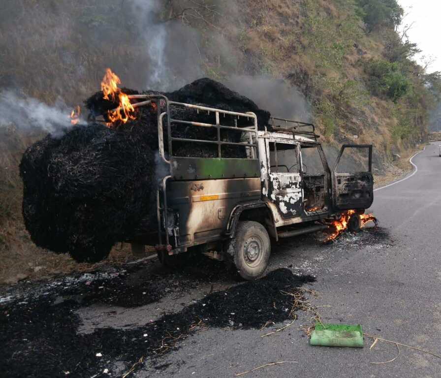 आज दिनांक 30/10/2025 को चौकी सहिया को सूचना प्राप्त हुई की जजरेट से 01 किलोमीटर आगे सहिया की तरफ एक पिकअप वाहन UK04CB-0265, जिसमें पुराली भरी हुई थी, में आग लग गई है।