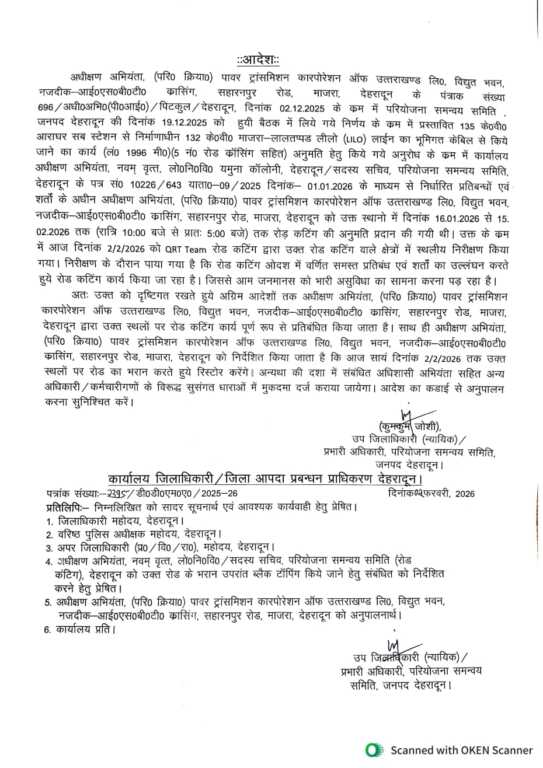 अधीक्षण अभियंता (परियोजना क्रियान्वयन), पावर ट्रांसमिशन कारपोरेशन ऑफ उत्तराखण्ड लिमिटेड (पिटकुल) द्वारा 135 के.वी. आराघर सब-स्टेशन से निर्माणाधीन 132 के.वी. माजरा-लालतप्पड़ एलआईएलओ लाइन को भूमिगत केबिल के माध्यम से बिछाने (कुल लंबाई 1996 मीटर, 5 रोड क्रॉसिंग सहित) हेतु रोड कटिंग की अनुमति का अनुरोध पर परियोजना समन्वय समिति, जनपद देहरादून ने 19.12.2025 को आयोजित बैठक में लिए गए निर्णय के क्रम में अधीक्षण अभियंता, नवम वृत्त, लोक निर्माण विभाग, यमुना कॉलोनी, देहरादून / सदस्य सचिव, परियोजना समन्वय समिति द्वारा पत्र 01.01.2026 के माध्यम से निर्धारित शर्तों एवं प्रतिबंधों के अधीन 16.01.2026 से 15.02.2026 तक, रात्रि 10 बजे से प्रातः 5 बजे तक रोड कटिंग की सशर्त अनुमति प्रदान की गई थी।