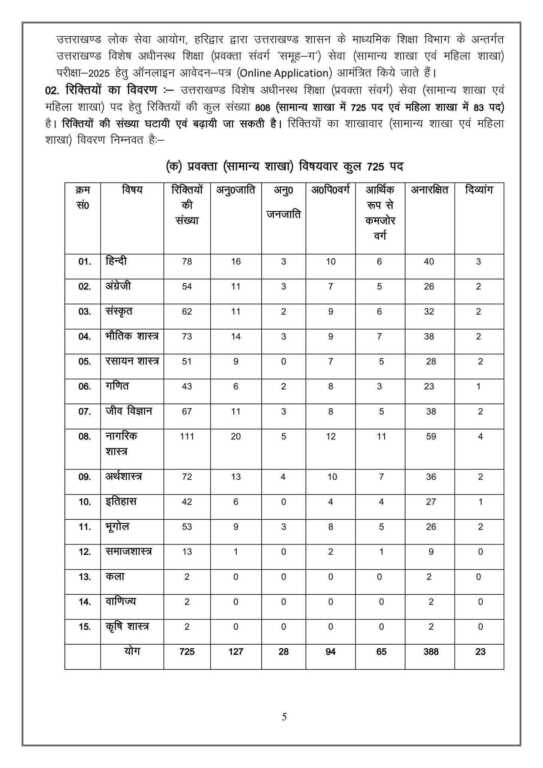 उत्तराखण्ड विशेष अधीनस्थ शिक्षा (प्रवक्ता संवर्ग ‘समूह-ग’) सेवा (सामान्य शाखा एवं महिला शाखा) परीक्षा-2025