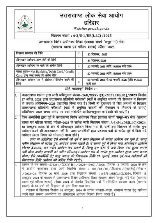 उत्तराखण्ड विशेष अधीनस्थ शिक्षा (प्रवक्ता संवर्ग ‘समूह-ग’) सेवा (सामान्य शाखा एवं महिला शाखा) परीक्षा-2025