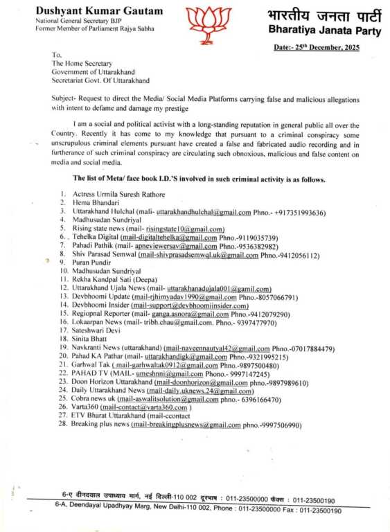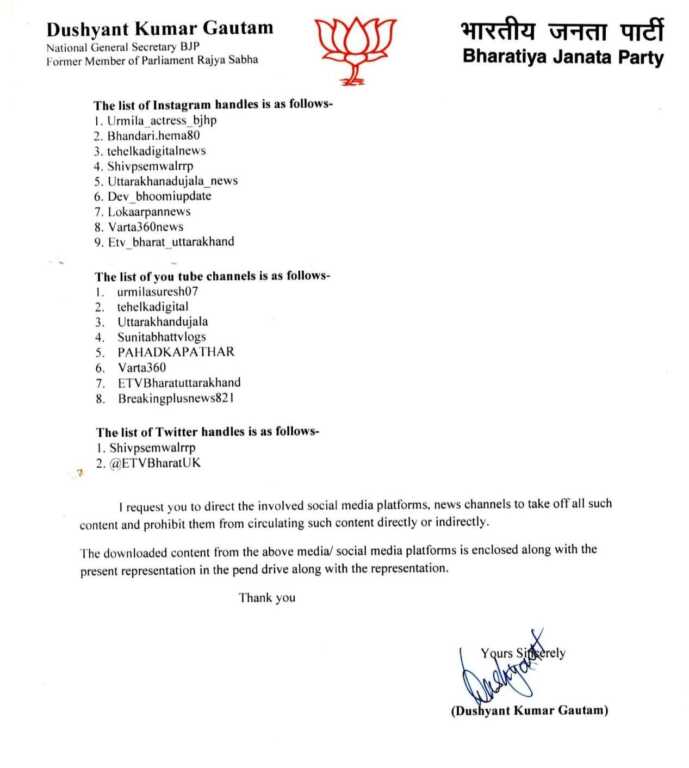 अंकिता हत्याकांड में उर्मिला सनावर की वायरल वीडियो में नाम आने के बाद भाजपा के राष्ट्रीय महासचिव और उत्तराखंड प्रभारी दुष्यंत कुमार गौतम ने सचिव गृह को पत्र भेजा है। उन्होंने इसे आपराधिक साजिश कराते देते हुए मीडिया, सोशल मीडिया प्लेटफॉर्म से आपत्तिजनक सामग्री हटवाने व प्रसार पर प्रतिबंध का अनुरोध किया है