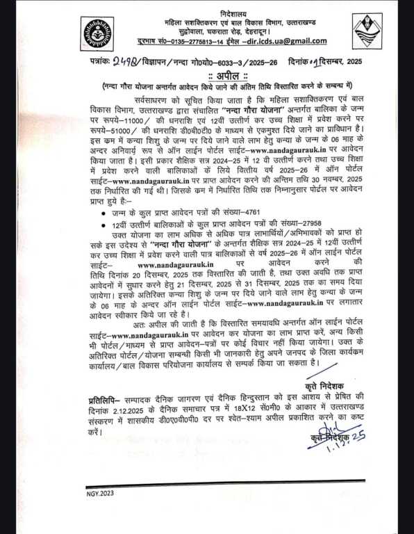 *देहरादून, ।* नंदा गौरा योजना के लिए अब 20 दिसंबर तक आवेदन किया जा सकता है। कैबिनेट मंत्री रेखा आर्या के निर्देशों के क्रम में विभाग ने आवेदन की अंतिम तारीख बढ़ाने का फैसला किया है।