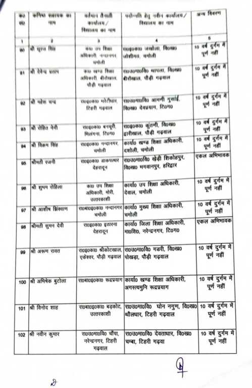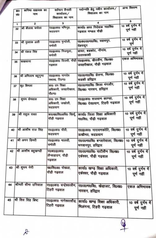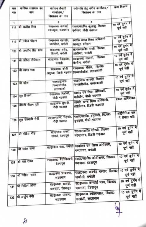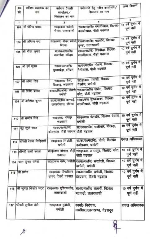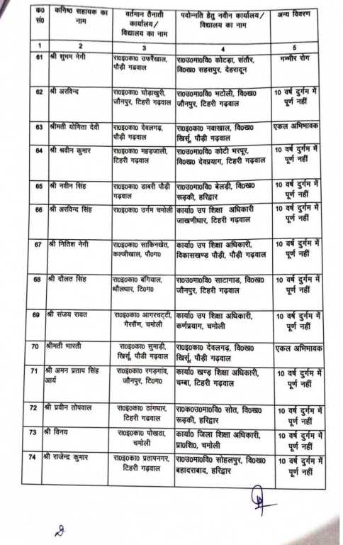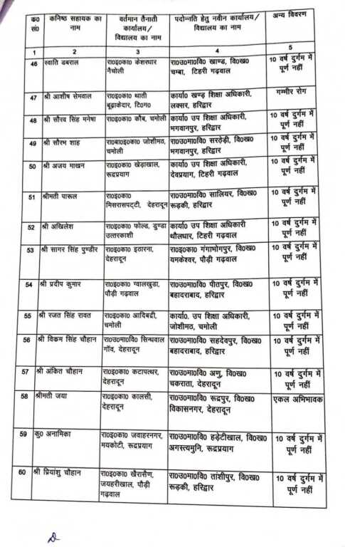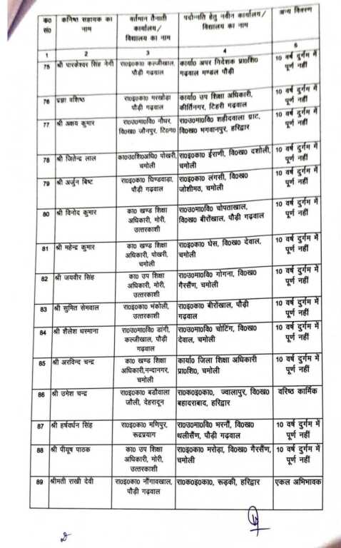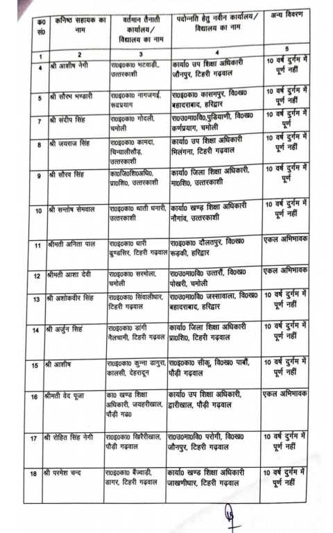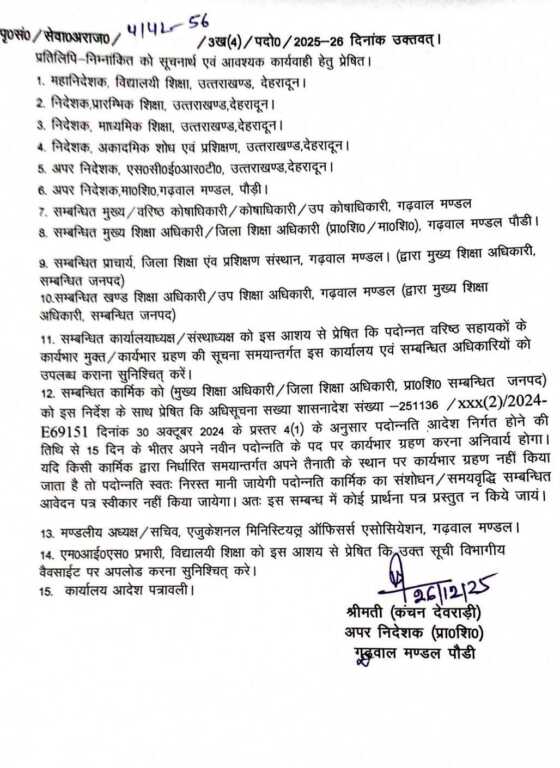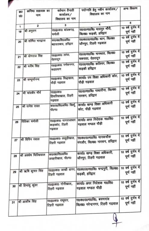 संख्या-251136/XXX(2)/2024-E69151 दिनांक 30 अक्टूबर 2024 के कम में उत्तराखण्ड लोक सेवकों के लिए वार्षिक स्थानान्तरण अधिनियम-2017 की धारा-18 (2) में निहित प्राविधानों के अन्तर्गत गठित समिति की संस्तुति पर निम्नांकित कनिष्ठ सहायक (वेतनमान रू0 21700-69100, लेवल-03) को वरिष्ठ सहायक (वेतनमान रू0 29200-92300, लेवल-05) के पद पर उनके नाम के सम्मुख स्तम्भ-4 में अंकित कार्यालय / संस्था में पदोन्नत करते हुये पदस्थापित किया जाता है। यह पदोन्नति नितान्त अस्थाई है, जो बिना पूर्व सूचना के किसी भी समय निरस्त की जा सकती है। इसके अतिरिक्त पदोन्नति पर पदस्थापन उत्तराखण्ड स्थानान्तरण अधिनियम 2017 के प्राविधानों / शासनादेश संख्या-124/xxiv-2/21-13(01) /2021 दिनांक 09 जुलाई 2021 तथा शासनादेश संख्या-1/289938/xxx(2)/2025E-33080 कार्मिक एवं सतर्कता अनुभाग-2 दिनांक 15 अप्रैल 2025 के अनुसार की जा रही हैं। इस सम्बन्ध में यदि मा० न्यायालय में कोई वाद विचाराधीन हो, तो यह पदोन्नतियां मा० न्यायालय में योजित वाद के अन्तिम निर्णय के अधीन रहेंगी। शासनादेश संख्या-251136/xxx (2)/2024-E69151 दिनांक 30 अक्टूबर 2024 के प्रस्तर-4 के अनुसार कार्मिक को पदोन्नति आदेश में कार्यभार ग्रहण करने हेतु अधिकतम पन्द्रह दिन की अवधि निर्धारित की गयी है। कार्यभार ग्रहण न करने की दशा में किसी भी परिस्थिति में अतिरिक्त समय नहीं दिया जा सकेगा। पदोन्नति का परित्याग करने वाले संबंधित कार्मिक को इस आशय का विधिवत् शपथ पत्र प्रस्तुत करना होगा कि वह भविष्य में पुनः कभी भी अपनी पदोन्नति की मांग नहीं करेगा और इसके परिणामस्वरूप चयन सूची में अगले पात्र कार्मिक को पदोन्नन किया जायेगा। एक बार पदोन्नति का परित्याग करने के पश्चात संबंधित कार्मिक को भविष्य में होने वाले पदोन्नति हेतु पात्रता सूची में सम्मिलित नहीं किया जाएगा।