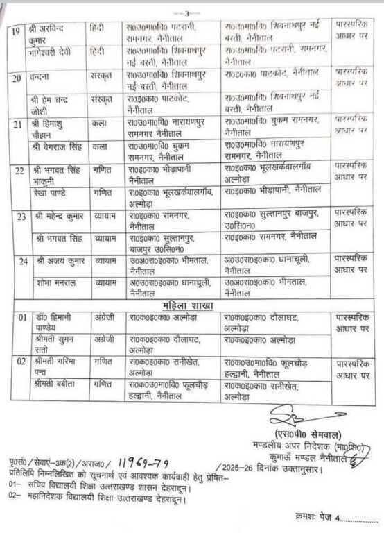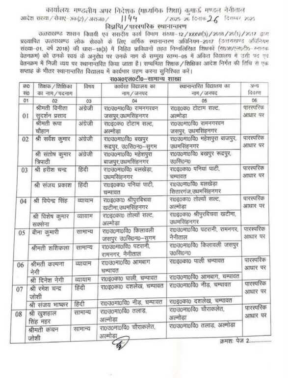 उत्तराखण्ड शासन विधायी एवं संसदीय कार्य विभाग संख्या-12/XXXVI (3)/2018/20(1)/2017 द्वारा प्रख्यापित उत्तराखण्ड लोक सेवकों के लिए वार्षिक स्थानान्तरण अधिनियम-2017 (उत्तराखण्ड अधिनियम संख्या-01. वर्ष 2018) की धारा-18(3) में निहित प्राविधानों तहत निम्नलिखित शिक्षकों (स०अ०एल०टी० स्नातक वेतनक्रम) को उनके स्वयं के अनुरोध पर उनके नाम के सम्मुख स्तम्भ-05 में अंकित विद्यालय में उसी पद एवं वेतनक्रम में निजी व्यय पर स्थानान्तरित किया जाता है। सम्बन्धित शिक्षक / शिक्षिका आदेश निर्गत की तिथि से एक सप्ताह के भीतर स्थानान्तरित विद्यालय में कार्यभार ग्रहण करना सुनिश्चित करें।