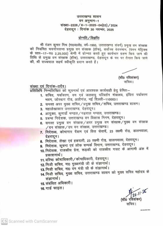 श्री रंजन कुमार मिश्र (भा०व०से०, वर्ष 1993, उत्तराखण्ड संवर्ग) प्रमुख वन संरक्षक को नियमित चयनोपरान्त प्रमुख वन संरक्षक (हॉफ), सर्वोच्च वेतनमान, (वेतन मैट्रिक्स के स्तर-17-50 2,25,000) श्रेणी में प्रोन्नत करते हुए कार्यभार ग्रहण किये जाने की तिथि से प्रमुख वन संरक्षक (हॉफ), उत्तराखण्ड, देहरादून के पद पर तैनात किये जाने की, श्री राज्यपाल सहर्ष स्वीकृति प्रदान करते हैं