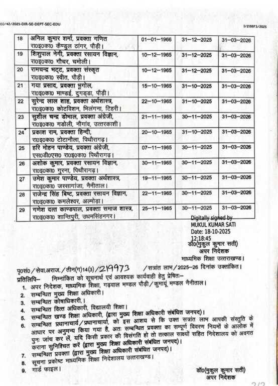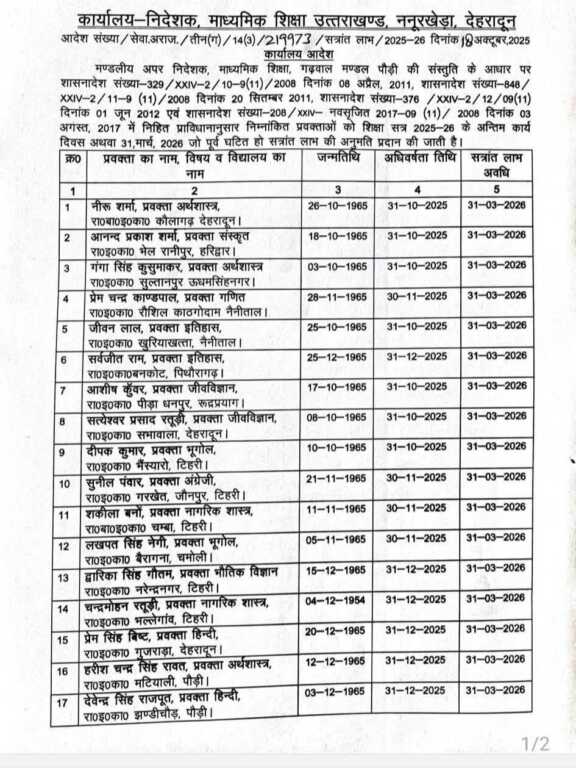 मण्डलीय अपर निदेशक, माध्यमिक शिक्षा, गढ़वाल मण्डल पौड़ी की संस्तुति के आधार पर शासनादेश संख्या-329/XXIV-2/10-9(11)/2008 दिनांक 08 अप्रैल, 2011, शासनादेश संख्या-848/XXIV-2/11-9 (11)/2008 दिनांक 20 सितम्बर 2011, शासनादेश संख्या-376 / XXIV-2/12/09(11) दिनांक 01 जून 2012 एवं शासनादेश संख्या-208/xxiv- नवसृजित 2017-09 (11) / 2008 दिनांक 03 अगस्त, 2017 में निहित प्राविधानानुसार निम्नांकित प्रवक्ताओं को शिक्षा सत्र 2025-26 के अन्तिम कार्य दिवस अथवा 31, मार्च, 2026 जो पूर्व घटित हो सत्रांत लाभ की अनुमति प्रदान की जाती