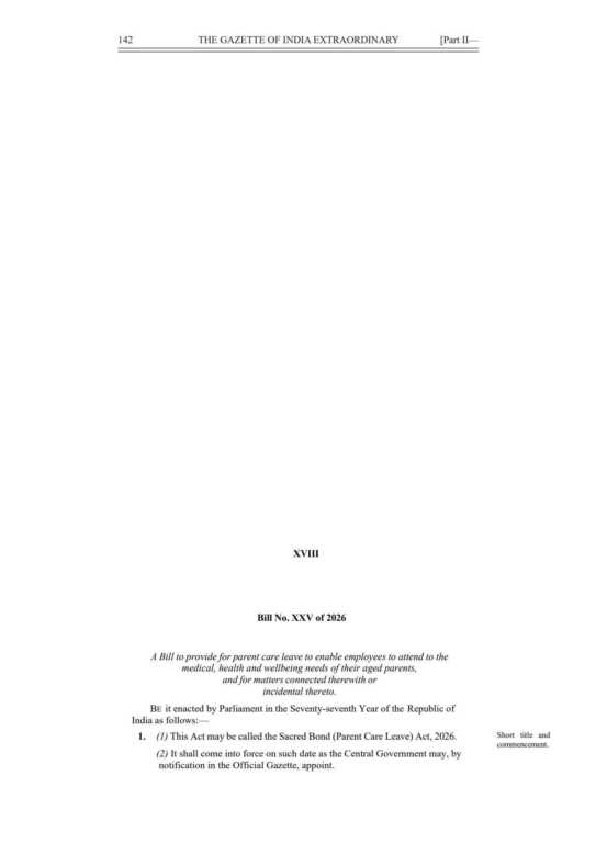 *”पवित्र बंधन (माता-पिता देखभाल अवकाश) विधेयक, 2026″ (The Sacred Bond (Parent Care Leave) Act, 2026)* का संक्षिप्त विवरण निम्न हैं:-