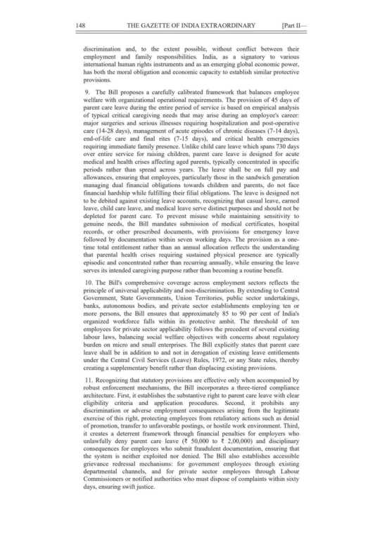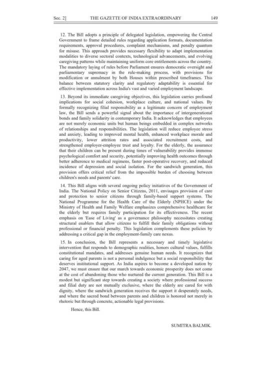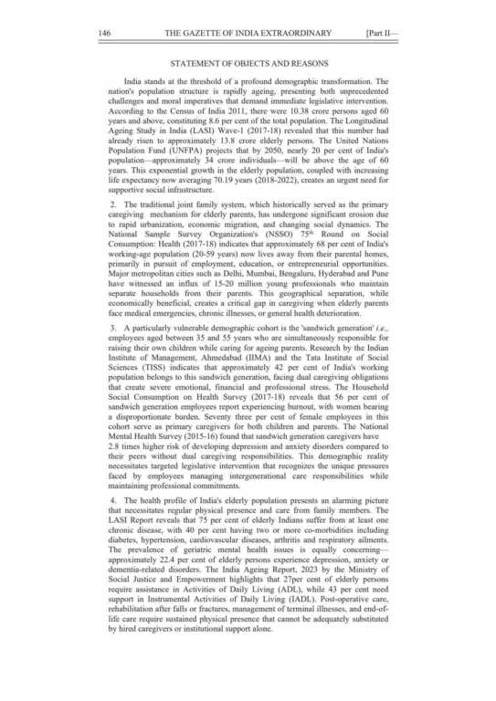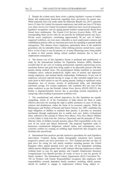 यह विधेयक कर्मचारियों को अपने वृद्ध माता-पिता के स्वास्थ्य, चिकित्सा और भलाई की देखभाल के लिए विशेष सवेतन अवकाश (Paid Leave) प्रदान करने के लिए तैयार किया गया है।