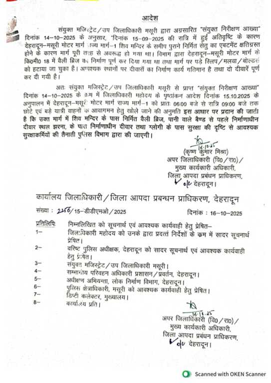 अतः संयुक्त मजिस्ट्रेट/उप जिलाधिकारी मसूरी से प्राप्त “संयुक्त निरीक्षण आख्या” दिनांक 14-10-2025 के क्रम में जिलाधिकारी महोदय के पृष्ठांकन आदेश दिनांक 15.10.2025 के अनुपालन में देहरादून-मसूरीः मोटर मार्ग राज्य मार्ग-1 को प्रातः 06:00 बजे से रात्रि 09:00 बजे तक छोटे एवं बड़े यात्री वाहनों के आवागमन हेतु खोले जाने की अनुमति इस आधार पर प्रदान की जाती है कि उक्त मार्ग में शिव मन्दिर के पास निर्मित वैली ब्रिज, पानी वाले बैण्ड से पहले निर्माणाधीन दीवार स्थल झरना, के पास निर्माणाधीन दीवार तथा ग्लोगी के पास सुरक्षा की दृष्टि से आवश्यक सुरक्षाकर्मियों की तैनाती पुलिस विभाग द्वारा की जाएगी।