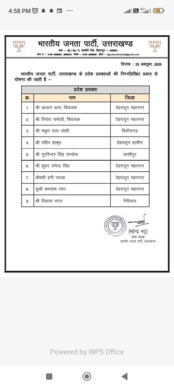 भाजपा के प्रदेश अध्यक्ष महेंद्र भट्ट ने प्रदेशभर में 9 प्रवक्ताओं के नाम का ऐलान कर दिया है। जिसकी लिस्ट भी जारी कर दी गई है। पार्टी के मुख्य प्रवक्ता के रूप में भाजपा विधायक खजानदास और विनोद चमोली को जिम्मेदारी दी है तो वहीं कमलेश रमन, हनी पाठक, मथुरा दत्त जोशी, कुंवर जपेंद्र सिंह, नवीन ठाकुर, गुरदरसमे सिंह चण्डोक, विकास भगत को प्रवक्ता बनाया है।