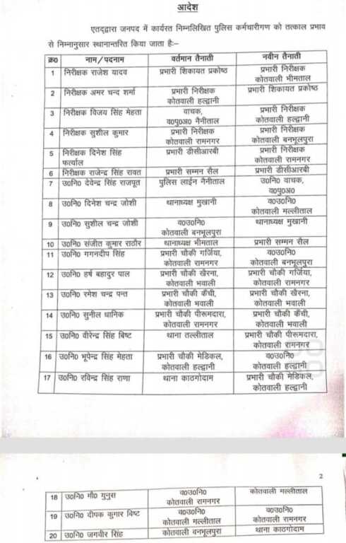 इंस्पेक्टर सुशील कुमार को बनभूलपुरा, राजेश यादव को भीमताल,दिनेश सिंह फर्त्याल को रामनगर कोतवाल का चार्ज