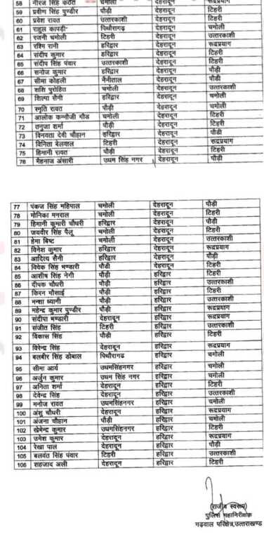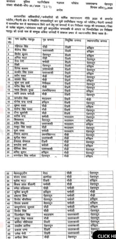 अराजपत्रित अधिकारियों/कर्मचारियों की वार्षिक स्थानान्तरण नीति 2020 के अन्तर्गत पर्वतीय / मैदानी क्षेत्र में निर्धारित समयावधिपूर्ण कर चुके उपनिरीक्षक ना०पु० को पर्वतीय / मैदानी जनपदों में पारस्परिक रूप से स्थानान्तरण किये जाने हेतु एवं जनपदों में उप निरीक्षक ना०पु० की उपलब्धता/रिक्त के सापेक्ष संतुलन / सामंजस्य रखते हुये आनुपातिक समयावधि के आधार पर निम्नलिखित उप निरीक्षक ना०पु० को उनके नाम के सम्मुख अंकित जनपदों में तत्काल प्रभाव से स्थानान्तरित किया जाता है-
