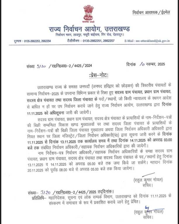 त्रिस्तरीय पंचायतों में खाली पदों पर 20 नवंबर को होंगे उपचुनाव, कल जारी होगी अधिसूचना