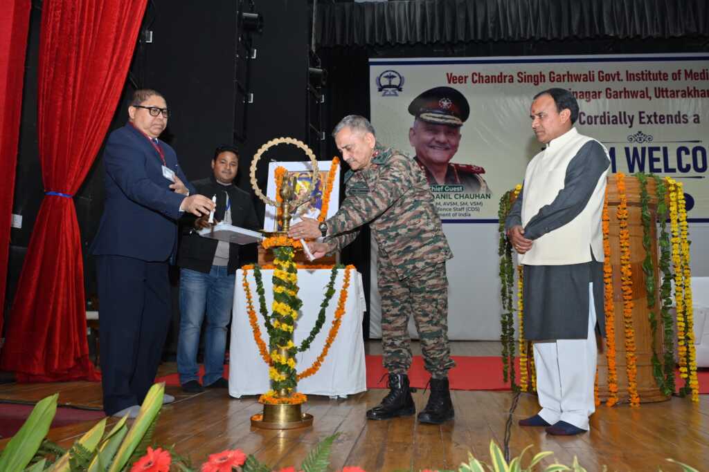 मेडिकल कॉलेज के प्रेक्षागृह में आयोजित कार्यक्रम का शुभारंभ मुख्य अतिथि सीडीएस जनरल अनिल चौहान, प्रदेश के चिकित्सा स्वास्थ्य एवं चिकित्सा शिक्षा मंत्री धन सिंह रावत तथा प्राचार्य आशुतोष सयाना ने मां सरस्वती के समक्ष दीप प्रज्ज्वलित कर किया।