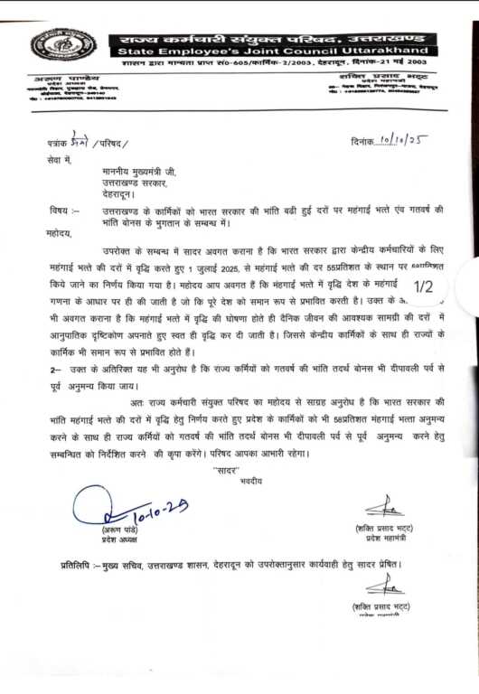 परिषद के प्रदेश प्रवक्ता आर पी जोशी के अनुसार भारत सरकार द्वारा केन्द्रीय कार्मिकों हेतु महंगाई भत्ते की दरों में वृद्धि करते हुए 01 जुलाई 2025 से महंगाई भत्ते की दर को संशोधित करते हुए 55% के स्थान पर 58% किए जाने की स्वीकृति प्रदान कर दी है । अतः परिषद द्वारा भी माननीय मुख्यमंत्री जी से उक्तानुसार प्रदेश में भी कार्मिको हेतु महंगाई भत्ते की दरों को संशोधित कर इसे 58% किए जाने एवं दीपावली बोनस दिए जाने का अनुरोध किया है ।