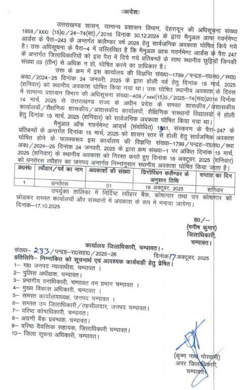 चंपावत जनपद में 18 अक्टूबर को धनतेरस का अवकाश आदेश पत्र हुआ जारी