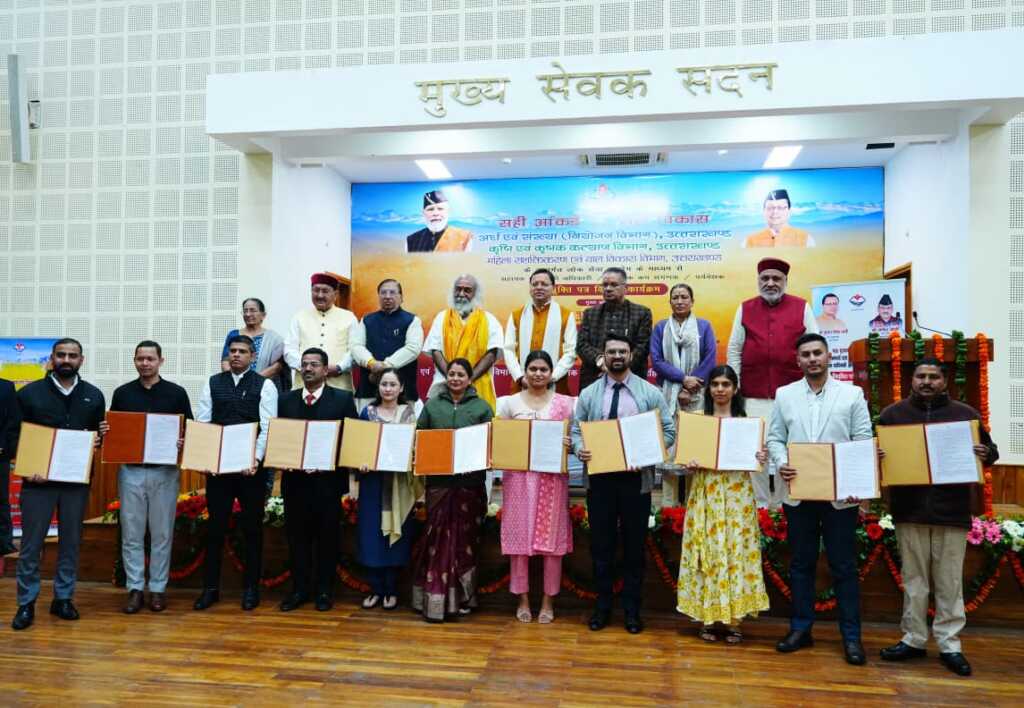 मुख्यमंत्री श्री पुष्कर सिंह धामी ने गुरूवार को मुख्यमंत्री कैम्प कार्यालय स्थित मुख्य सेवक सदन में आयोजित कार्यक्रम में लोक सेवा आयोग के माध्यम से चयनित अर्थ एवं संख्या, कृषि एवं उद्यान तथा महिला सशक्तिकरण एवं बाल विकास विभाग के 178 अभ्यर्थियों को नियुक्ति पत्र प्रदान किए। जिसमें अर्थ एवं संख्या विभाग के 117, कृषि विभाग के 12 उद्यान विभाग के 30 तथा महिला सशक्तिकरण एवं बाल विकास विभाग के 19 अभ्यर्थी शामिल है।