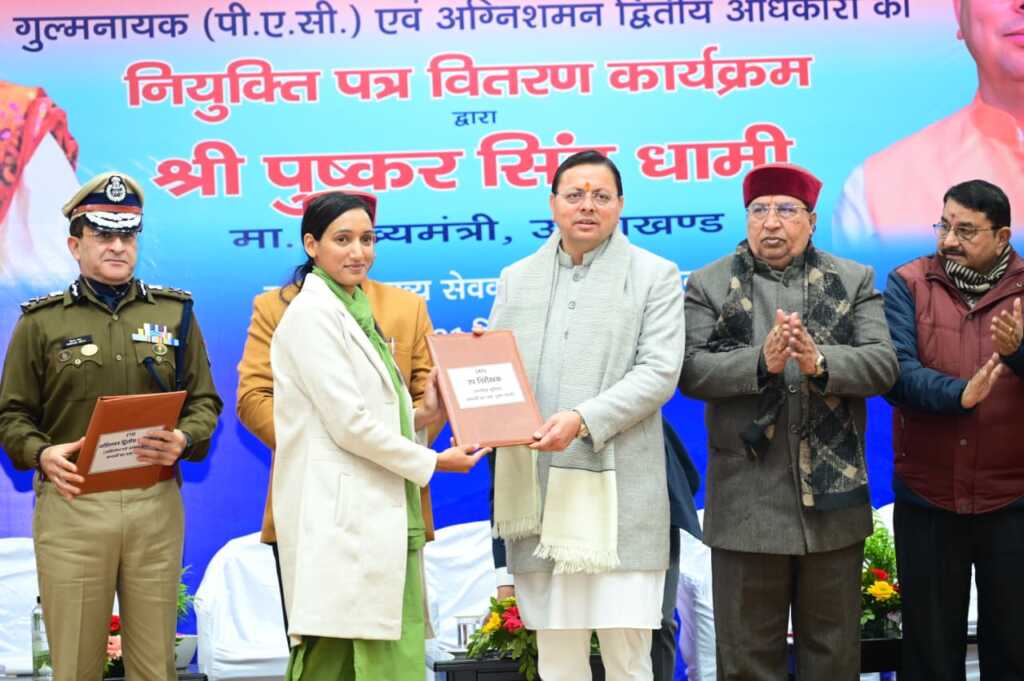 मुख्यमंत्री पुष्कर सिंह धामी ने बुधवार को मुख्यमंत्री कैम्प कार्यालय स्थित मुख्य सेवक सदन में 215 उपनिरीक्षकों को नियुक्ति पत्र प्रदान किये। जिसमें 104 उप-निरीक्षक, 88 गुल्मनायक (पी.ए.सी) एवं 23 अग्निशमन द्वितीय अधिकारी शामिल हैं।