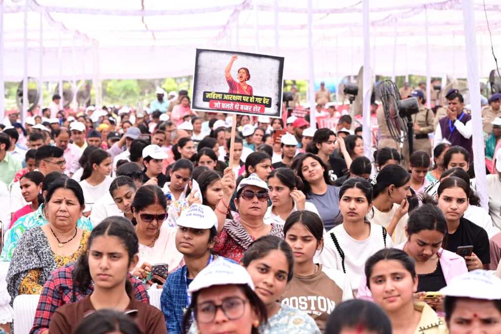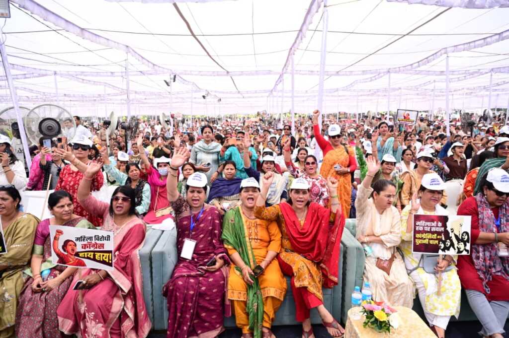 मुख्यमंत्री ने कहा प्रधानमंत्री द्वारा देश की आधी आबादी को उसका हक दिलाने के प्रयास को लोकसभा में विपक्ष ने विफल करके देश के साथ महा पाप किया है।मुख्यमंत्री ने कहा प्रधानमंत्री श्री नरेंद्र मोदी ने मातृशक्ति को नए भारत के निर्माण का आधार माना है। महिलाओं को सशक्त, सक्षम और आत्मनिर्भर बनाने की दिशा में कई ऐतिहासिक कार्य किए गए हैं। बेटी बचाओं-बेटी पढ़ाओं अभियान, उज्ज्वला योजना, एवं जन धन योजना द्वारा करोड़ों बहनों को बैंकिंग प्रणाली से जोड़ा, स्टार्टअप योजना के माध्यम से लाखों महिलाओं को सशक्त बनाने, लखपति दीदी योजना द्वारा महिलाओं को आत्मनिर्भर बनाने और ट्रिपल तलाक जैसी कुप्रथा को समाप्त कर महिलाओं को आगे बढ़ने का काम किया गया है। मुख्यमंत्री ने कहा प्रधानमंत्री की प्रेरणा से देश के प्रत्येक क्षेत्र में महिलाएँ आगे आ रही हैं। आदिवासी समाज की बेटी, देश के सर्वोच्च संवैधानिक पद तक पहुंची हैं। केंद्रिय मंत्री श्रीमती निर्मला सीतारमण को वित्त मंत्रालय जैसा महत्वपूर्ण मंत्रालय दिया गया है।