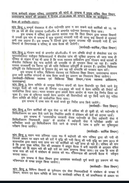 देहरादून। शासन द्वारा दिनांक 27 फरवरी 2026 को आयोजित बैठक का कार्यवृत्त जारी कर दिया गया है, जिसमें राज्य कर्मचारी संयुक्त परिषद की विभिन्न मांगों पर विस्तार से चर्चा करते हुए संबंधित विभागों को आवश्यक कार्यवाही के निर्देश दिए गए हैं।