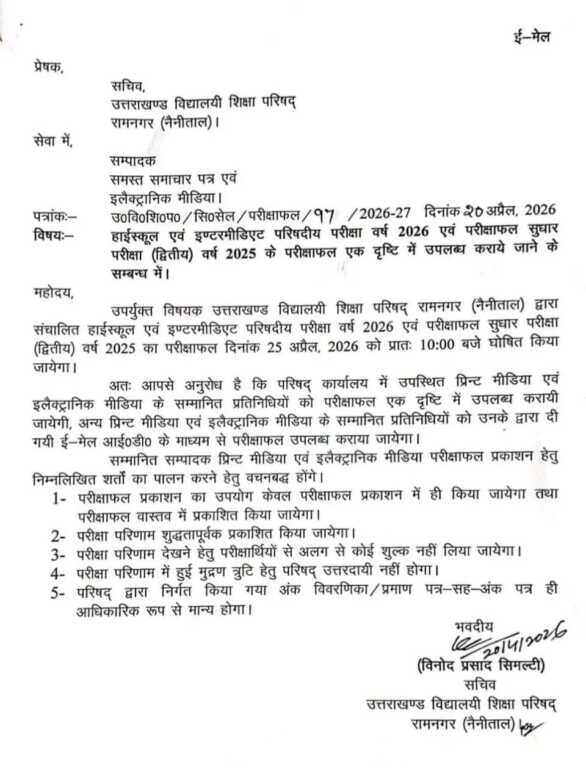उत्तराखंड बोर्ड परीक्षा का रिजल्ट इस बार 25 अप्रैल को घोषित किया जाएगा। उत्तराखंड बोर्ड के सचिव विनोद सिमल्टी 10वीं-12वीं कक्षा का रिजल्ट सुबह 10:00 बजे घोषित किया जाएगा