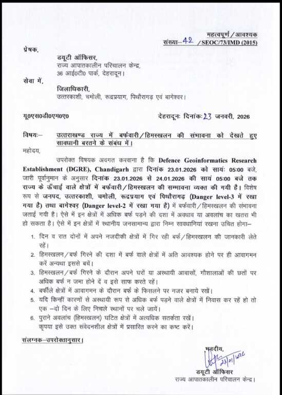 देहरादून : राज्य के उच्च हिमालयी क्षेत्रों में बर्फबारी एवं हिमस्खलन की चेतावनी जारी