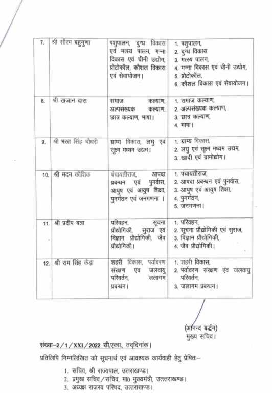 देहरादून : धामी सरकार में नव नियुक्त कैबिनेट मंत्रियों को बाँटे गए विभाग