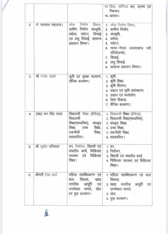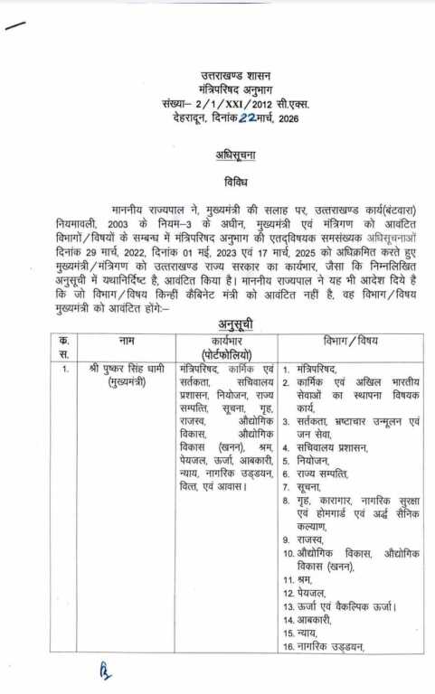 देहरादून : धामी सरकार में नव नियुक्त कैबिनेट मंत्रियों को बाँटे गए विभाग