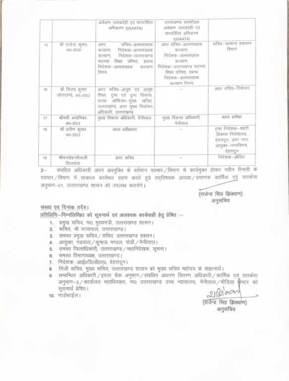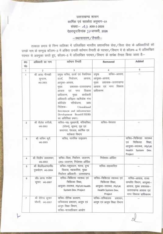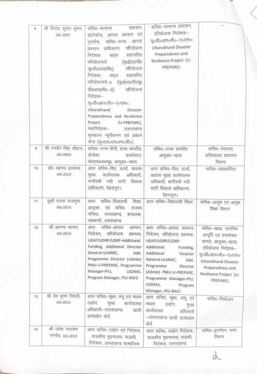 IAS संवर्ग में प्रमुख स्तर पर बदलाव किए गए हैं। वर्ष 2001 बैच के अधिकारी श्री आर. मीनाक्षी सुन्दरम से प्रमुख सचिव ऊर्जा, नियोजन सहित अन्य अतिरिक्त प्रभार हटाते हुए उन्हें प्रमुख सचिव आवास, आयुक्त आवास एवं मुख्य प्रशासक उत्तराखण्ड आवास एवं नगर विकास प्राधिकरण की जिम्मेदारी दी गई है।