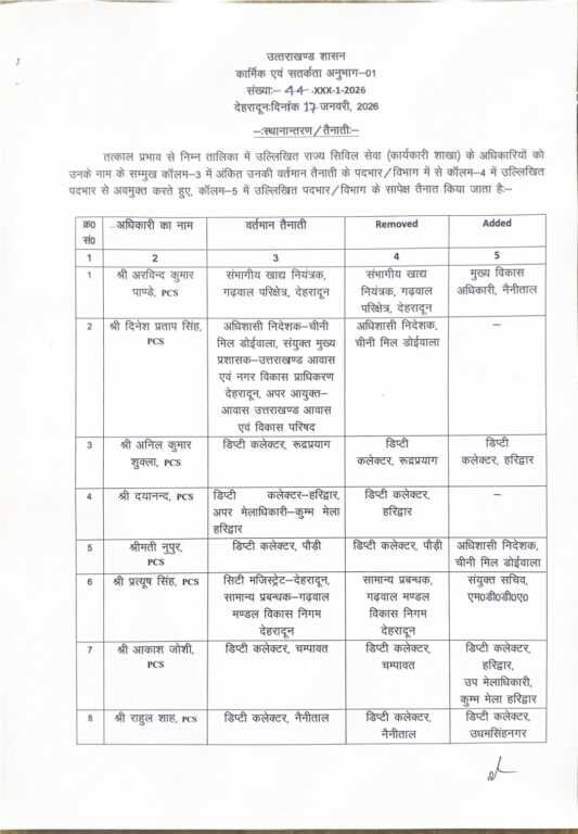 श्री अनिल कुमार शुक्ला को डिप्टी कलेक्टर हरिद्वार भेजा गया है।