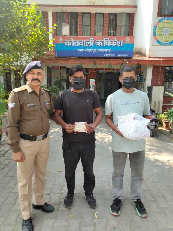 ऋषिकेश पुलिस द्वारा थाना क्षेत्र में अलग–अलग स्थानो पर चैकिग के दौरान 02 अभियुक्तों, चेतन पंवार पुत्र श्री सोबन सिह पंवार निवासी शान्तिनगर ढालवाला थाना मुनि की रेती जनपद टिहरी गढवाल उम्र -31 वर्ष को 01 किलो 440 ग्राम गांजे व मनीष बिष्ट उर्फ चट्टानीपुत्र श्री कमल सिह बिष्ट निवासी डांडी गांव झीलवाला थाना रानीपोखरी जनपद देहरादून को 6.23 ग्राम अवैध स्मैक की तस्करी करते हुये गिरफ्तार किया गया। अभियुक्तों के विरूद्ध थाना ऋषिकेश मे एनडीपीएस एक्ट के अन्तर्गत अभियोग पंजीकृत किया गया।