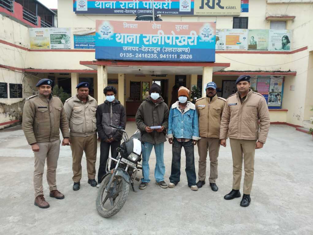 घटना के अनावरण तथा अभियुक्तों की गिरफ्तारी हेतु वरिष्ठ पुलिस अधीक्षक देहरादून द्वारा थाना रानीपोखरी पर गठित पुलिस टीम को आवश्यक निर्देश दिये। निदेशों के अनुपालन में पुलिस टीम द्वारा घटना स्थल का बारीकी से निरीक्षण करते हुए घटना स्थल के आस-पास तथा आने जाने वाले रास्तों पर लगे सीसीटीवी कैमरों की फुटेजों की सहायता से संदिग्धों के सम्बन्ध में आवश्यक जानकारियां एकत्रित की गई। प्राप्त जानकारी के आधार पर सुरागरसी-पतारसी करते हुए स्थानीय मुखबिर तंत्र को भी सक्रिय किया गया। साथ ही पूर्व में इस प्रकार के अपराधों में प्रकाश में आये अभियुक्तों का भौतिक सत्यापन करते हुए उनकी वर्तमान स्थिती के सम्बन्ध में आवश्यक जानकारी एकत्रित की गई। पुलिस टीम द्वारा किये गये प्रयासांे के परिणाम स्वरूप दिनांक: 20.12.2025 को गश्त के दौरान मुखबिर की सूचना पर भानियावाला की ओर से मोटर साइकिल से आ रहे 03 संदिग्ध व्यक्तियों को रूकने का इशारा किया गया तो मोटर साइकिल सवार पुलिस टीम को देखकर मोटर साइकिल को विपरीत दिशा में घुमाकर भागने का प्रयास करने लगे। जिन्हें पुलिस टीम द्वारा नागाघेर/जाखन नदी पुल के पास से घेर घोटकर पकड लिया गया।