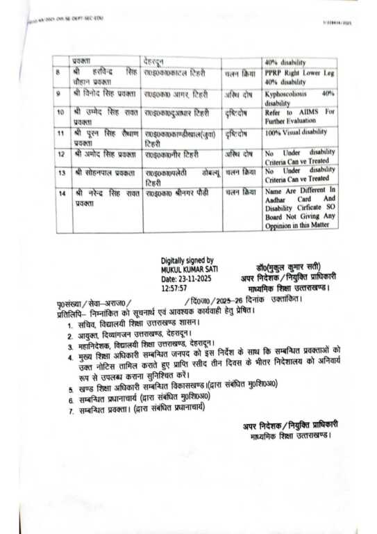 मा० उच्च न्यायालय द्वारा पारित आदेश के अनुपालन में दिनांक 22.11.2025 को आयुक्त दिव्यांगजन उत्तराखण्ड द्वारा प्रकरण की सुनवाई की गयी। सुनवाई के उपरान्त मा० आयुक्त दिव्यांगजन द्वारा जनहित याचिका के संलग्नक-2 में दाखिल सूची की प्रति उपलब्ध कराते हुए सूची में अंकित राज्य चिकित्सा परिषद द्वारा अनर्ह कार्मिक / शिक्षकों के विरुद्ध दिव्यांगजन अधिकार अधिनियम 2016 की धारा-91 के अन्तर्गत महानिदेशक चिकित्सा स्वास्थ्य एवं परिवार कल्याण, उत्तराखण्ड के पत्रांक/6088/ दिनांक 21.03.2022 के संदर्भ में शिक्षा विभाग में निःशक्ता से ग्रस्त प्रवक्ताओं के दिनांक 16.04.2022 एवं दिनांक 18.04.2022 को दिव्यांगता के मूल्यांकन से सम्बन्धित आख्या निदेशालय को प्रेषित करते हुए नियुक्ति प्राधिकारी के स्तर से अग्रेत्तर कार्यवाही किये जाने के निर्देश दिये गये हैं। सूची का निदेशालय स्तर पर परीक्षण कर परीक्षणोपरान्त संज्ञान में आया है कि उक्त सूची में प्रवक्ता संवर्ग में 14 कार्यरत प्रवक्ताओं का भी तद्समय महानिदेशक चिकित्सा स्वास्थ्य एवं परिवार कल्याण, उत्तराखण्ड द्वारा दिव्यांगता से सम्बन्धित प्रमाण पत्रों का मूल्यांकन किया गया, जिसके क्रम में निम्नवत् सूची में अंकित प्रवक्ताओं को निर्देशित किया जाता है कि महानिदेशक चिकित्सा स्वास्थ्य एवं परिवार कल्याण, उत्तराखण्ड द्वारा कॉलम 5 में विवरण अंकित के सम्बन्ध में अपना पक्ष सुस्पष्ट आख्या एवं अपने दिव्यांगता के प्रमाण पत्र सहित नोटिस निर्गत के 15 दिनों के भीतर दिव्यांगता के प्रमाण पत्र के सम्बन्ध में अधोहस्ताक्षरी के सम्मुख सुस्पष्ट साक्ष्यों सहित उपस्थित होना सुनिश्चित करें, निर्धारित अवधि में उपस्थित न होने की दशा में आपके विरुद्ध एकतरफा कार्यवाही कर दी जायेगी जिसका सम्पूर्ण उत्तरदायित्व आपका होगा।