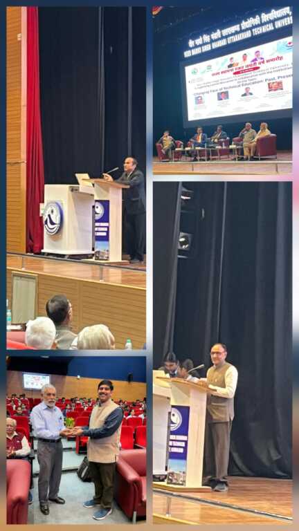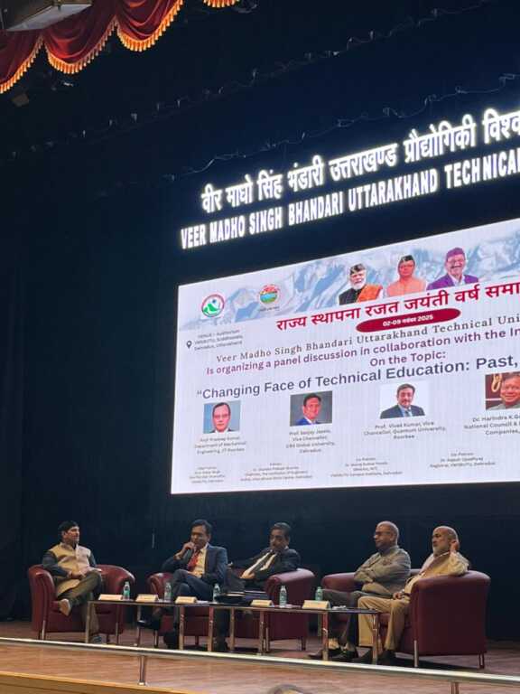 राज्य स्थापना रजत जयंती वर्ष समारोह के उपलक्ष्य पर वीर माधो सिंह भंडारी उत्तराखण्ड प्रौद्योगिकी विश्वविद्यालय देहरादून में इंस्टीटूशन ऑफ इंजीनियर्स के सयुक्त तत्वाधान में “Changing Face of Technical Education: Past, Present and Future” विषय पर पैनल डिस्कशन का आयोजन किया गया। श्री के.सी.मिश्रा द्वारा जानकारी साझा करते हुए बताया कि कार्यक्रम का सुभारम्भ विश्वविद्यालय कुलगीत व दीप प्रज्वलन से हुआ। कार्यक्रम की प्रारंभिक व्याख्यान प्रोफ. मनोज कुमार पांडा, निदेशक महिला प्रौद्योगिकी संस्थान, देहरादून द्वारा किया गया। कार्यक्रम को आगे बढ़ाते हुए इंस्टीटूशन ऑफ इंजीनियर्स के उत्तराखण्ड चैप्टर के चेयरमैन इंजी.चंद्र प्रकाश शर्मा ने टेक्निकल एजुकेशन में हो रहे परिवर्तन के विषय पर छात्र-छात्रों को अवगत करवाया।