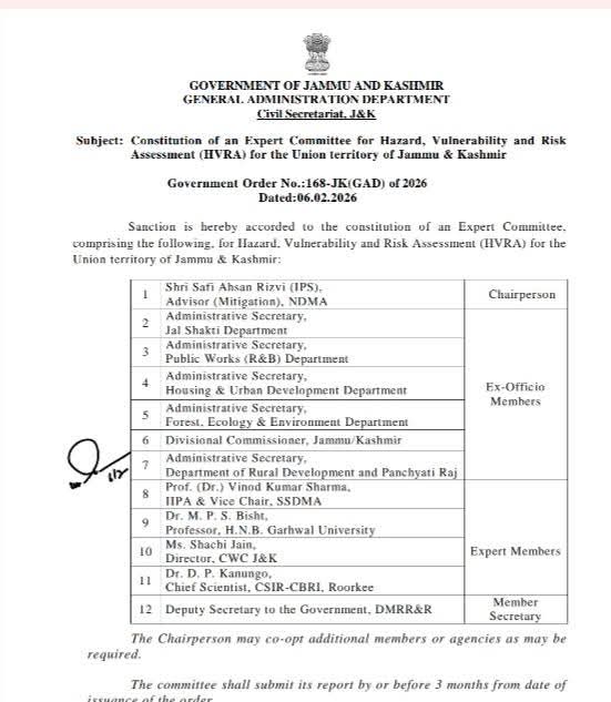 यह समिति जम्मू-कश्मीर केंद्रशासित प्रदेश में भूकंप, बाढ़, भूस्खलन, ग्लेशियल लेक आउटबर्स्ट फ्लड (GLOF), वनाग्नि सहित बहु-आपदाओं के जोखिम का वैज्ञानिक आकलन करेगी। साथ ही खतरा मानचित्रण, जोन निर्धारण, HVRA एटलस की तैयारी तथा अल्पकालिक, मध्यमकालिक और दीर्घकालिक रणनीतियों को शासन एवं विकास योजनाओं में एकीकृत करने के लिए ठोस सिफारिशें प्रस्तुत करेगी।
