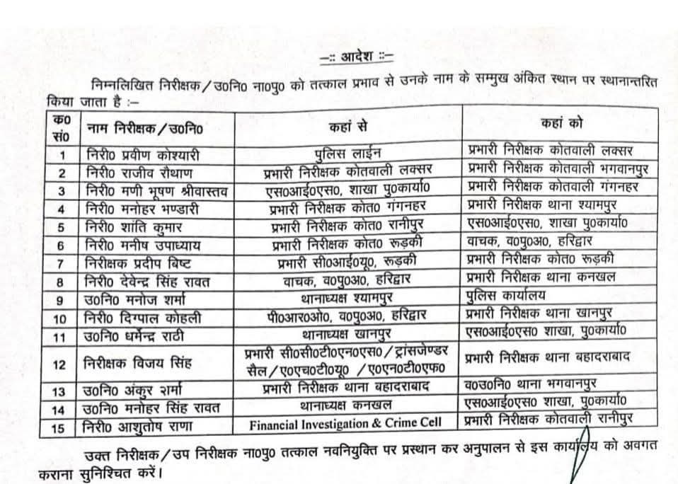 हरिद्वार पुलिस कप्तान ने किए दर्जनभर से भी अधिक तबादले देखें किसे कौनसा थाना मिला और किसे मिली लाइन ,,,,