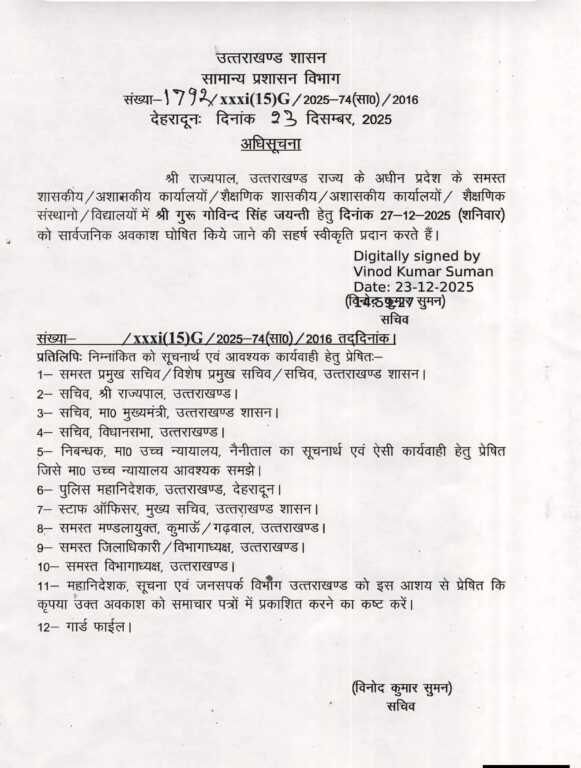 श्री राज्यपाल, उत्तराखण्ड राज्य के अधीन प्रदेश के समस्त शासकीय/अशासकीय कार्यालयों / शैक्षणिक शासकीय/अशासकीय कार्यालयों / शैक्षणिक संस्थानो / विद्यालयों में श्री गुरू गोविन्द सिंह जयन्ती हेतु दिनांक 27-12-2025 (शनिवार) को सार्वजनिक अवकाश घोषित किये जाने की सहर्ष स्वीकृति प्रदान करते हैं।