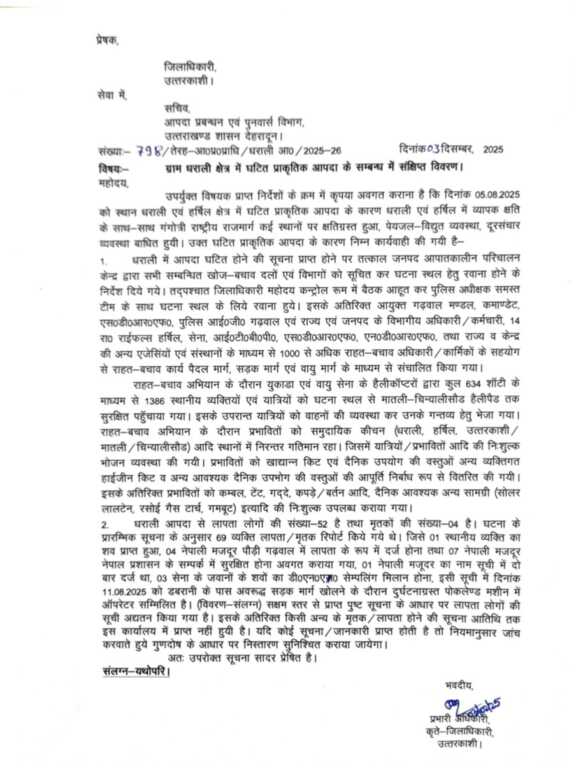 उपर्युक्त विषयक प्राप्त निर्देशों के क्रम में कृपया अवगत कराना है कि दिनांक 05.08.2025 को स्थान धराली एवं हर्षिल क्षेत्र में घटित प्राकृतिक आपदा के कारण धराली एवं हर्षिल में व्यापक क्षति के साथ-साथ गंगोत्री राष्ट्रीय राजमार्ग कई स्थानों पर क्षतिग्रस्त हुआ, पेयजल विद्युत व्यवस्था, दूरसंचार व्यवस्था बाधित हुयी। उक्त घटित प्राकृतिक आपदा के कारण निम्न कार्यवाही की गयी है-