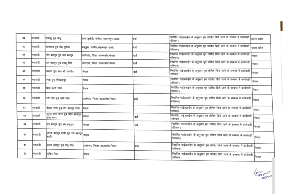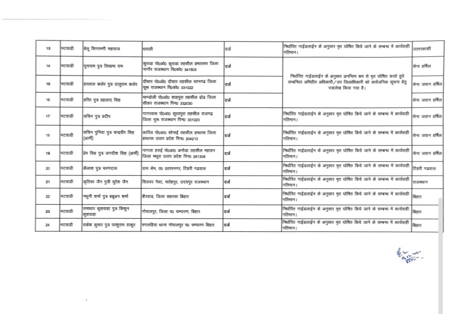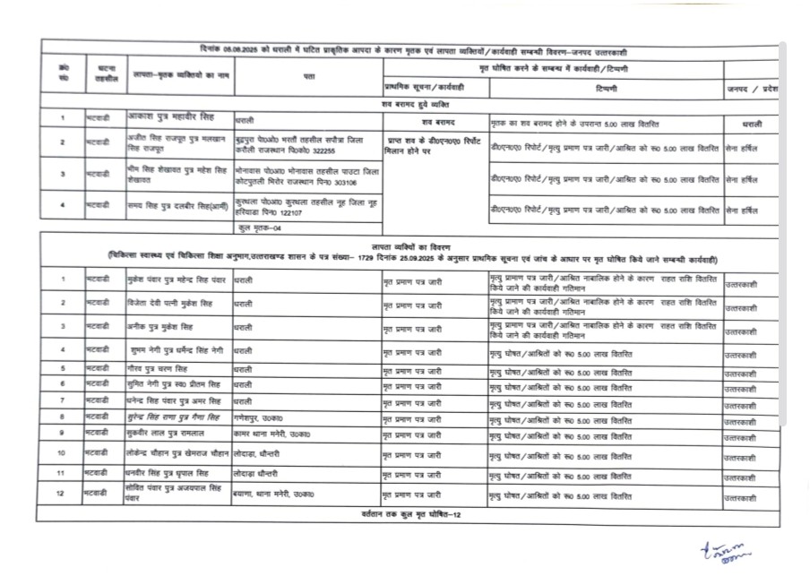 2. धराली आपदा से लापता लोगों की संख्या 52 है तथा मृतकों की संख्या-04 है। घटना के प्रारम्भिक सूचना के अनुसार 69 व्यक्ति लापता / मृतक रिपोर्ट किये गये थे। जिसे 01 स्थानीय व्यक्ति का शव प्राप्त हुआ, 04 नेपाली मजदूर पौड़ी गढ़वाल में लापता के रूप में दर्ज होना तथा 07 नेपाली मजदूर नेपाल प्रशासन के सम्पर्क में सुरक्षित होना अवगत कराया गया, 01 नेपाली मजूदर का नाम सूची में दो बार दर्ज था, 03 सेना के जवानों के शवों का डी०एन०एन० सेम्पलिंग मिलान होना, इसी सूची में दिनांक 11.08.2025 को डबरानी के पास अवरूद्ध सड़क मार्ग खोलने के दौरान दुर्घटनाग्रस्त पोकलेण्ड मशीन में ऑपरेटर सम्मिलित है। (विवरण-संलग्न) सक्षम स्तर से प्राप्त पुष्ट सूचना के आधार पर लापता लोगों की सूची अद्यतन किया गया है। इसके अतिरिक्त किसी अन्य के मृतक / लापता होने की सूचना आतिथि तक इस कार्यालय में प्राप्त नहीं हुयी है। यदि कोई सूचना/जानकारी प्राप्त होती है तो नियमानुसार जांच करवाते हुये गुणदोष के आधार पर निस्तारण सुनिश्चित कराया जायेगा।