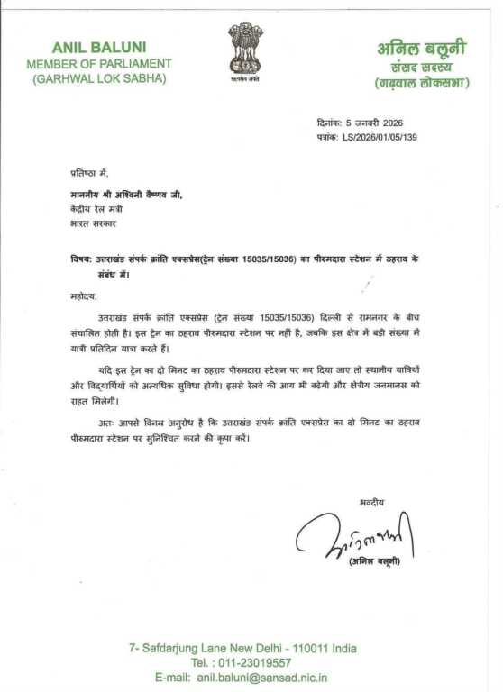 सांसद अनिल बलूनी ने महत्वपूर्ण जानकारी सोशल मीडिया मे जारी करते हुए कहा की गत दिनों रामनगर में स्थानीय निवासियों ने एक महत्वपूर्ण समस्या से अवगत कराया था कि उत्तराखंड संपर्क क्रांति एक्सप्रेस (15035/15036) का पीरूमदारा स्टेशन पर ठहराव न होने के कारण क्षेत्र के यात्रियों, विद्यार्थियों, बुजुर्गों एवं व्यापारियों को रामनगर आने-जाने में काफी कठिनाइयों का सामना करना पड़ता था।