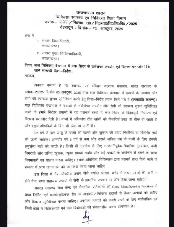 भारत सरकार, स्वास्थ्य एवं परिवार कल्याण मंत्रालय की ओर से 3 अक्टूबर 2025 को जारी एडवाइजरी के अनुपालन में राज्य में भी बच्चों में कफ सिरप के विवेकपूर्ण उपयोग और वितरण पर विशेष बल दिया गया है।