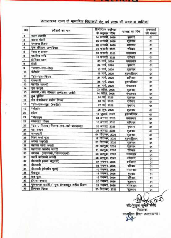 उपर्युक्त विषयक उत्तराखण्ड शासन, सामान्य प्रशासन विभाग के पत्र संख्या-1800-1809 /xxxi (15)G/25-74(सा0)/2016 दिनांक 24 दिसम्बर, 2025 के क्रम में राज्य के माध्यमिक विद्यालयों हेतु ग्रीष्मकालीन / शीतकालीन अवकाश के साथ अन्य अवकाश हेतु वर्ष 2026 की अवकाश तालिका तैयार की गई है। वर्ष 2026 की अवकाश तालिका में निर्धारित माहवार कुल कार्य दिवसों का आवंटन किया गया है।