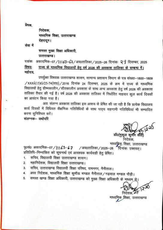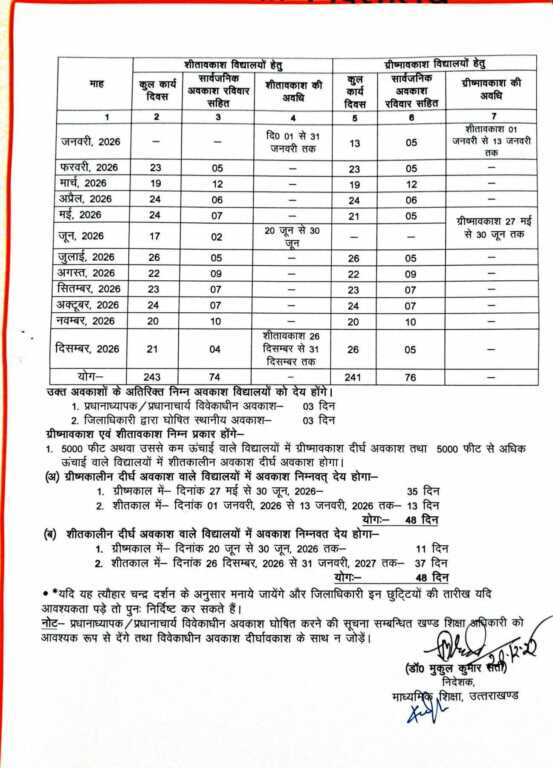 उपर्युक्त विषयक उत्तराखण्ड शासन, सामान्य प्रशासन विभाग के पत्र संख्या-1800-1809 /xxxi (15)G/25-74(सा0)/2016 दिनांक 24 दिसम्बर, 2025 के क्रम में राज्य के माध्यमिक विद्यालयों हेतु ग्रीष्मकालीन / शीतकालीन अवकाश के साथ अन्य अवकाश हेतु वर्ष 2026 की अवकाश तालिका तैयार की गई है। वर्ष 2026 की अवकाश तालिका में निर्धारित माहवार कुल कार्य दिवसों का आवंटन किया गया है।