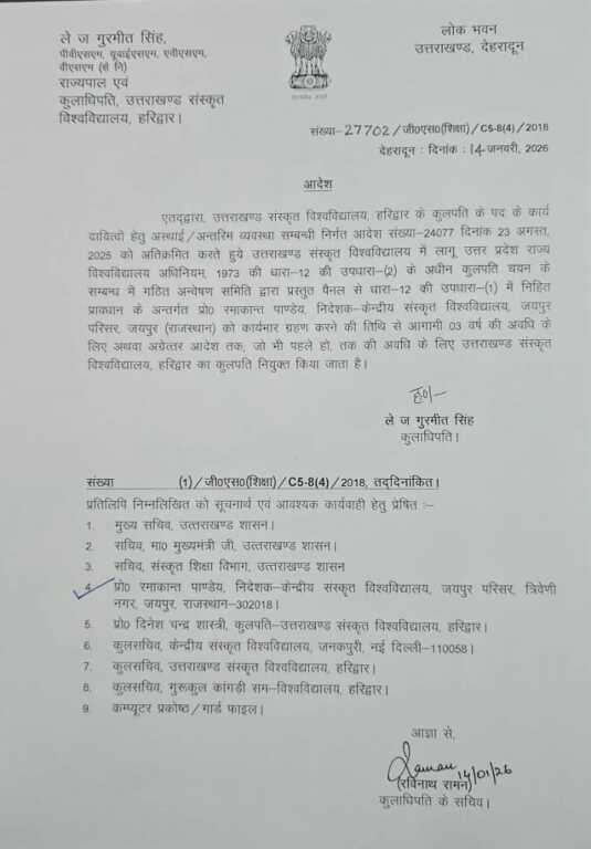 अन्वेषण समिति द्वारा प्रस्तुत पैनल से धारा-12 की उपधारा (1) में निहित प्रावधान के अन्तर्गत प्रो० रमाकान्त पाण्डेय, निदेशक केन्द्रीय संस्कृत विश्वविद्यालय, जयपुर परिसर, जयपुर (राजस्थान) को कार्यभार ग्रहण करने की तिथि से आगामी 03 वर्ष की अवधि के लिए अथवा अग्रेत्तर आदेश तक, जो भी पहले हो, तक की अवधि के लिए उत्तराखण्ड संस्कृत विश्वविद्यालय, हरिद्वार का कुलपति नियुक्त किया जाता है।