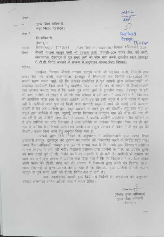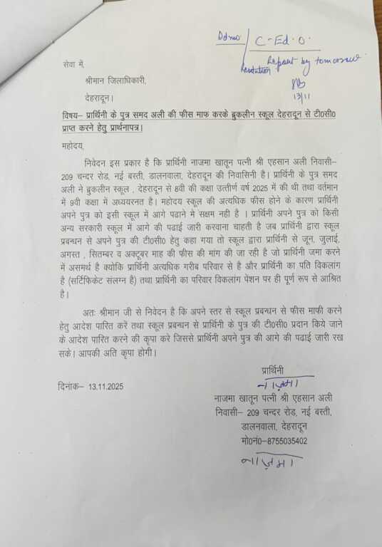 देहरादून ) विगत दिवस 13 नवम्बर 2025 को चन्दर रोड निवासी नाजमा खातून ने डीएम से गुहार लगाई कि उनके बेटे समद अली ने ब्रूकलीन स्कूल से 08 वीं की परीक्षा उर्तीण तथा 9 वीं कक्षा में अध्ययनरत् है। विद्यालय की फीस अधिक होने के कारण वह उस स्कूल में बच्चे की पढाई जारी रखने में सक्षम नही है। आगे की पढाई अन्य स्कूल से कराना चाहती हैं तथा जून से अक्टूबर तक की फीस स्कूल में जमा न करवा पाने के कारण स्कूल प्रबन्धन टीसी नही दे रहा है,जिससे बच्चे की पढाई बाधित हो रही है। पति दिव्यांग है तथा वह फीस भरने में असमर्थ है।